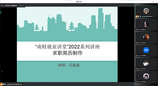 为了使即将实习的同学们在日后应聘工作时更加顺利,准备更加充分,由我校大学生就业与创业指导中心、金沙城js9线路检测中心主办,校职业发展与就业协会协办的,南财就业讲堂系列讲座之 “简历制作与面试技巧”于4月28日18点至21点30分通过腾讯会议在线上顺利举办。我校150余名学生参加了此次讲座。