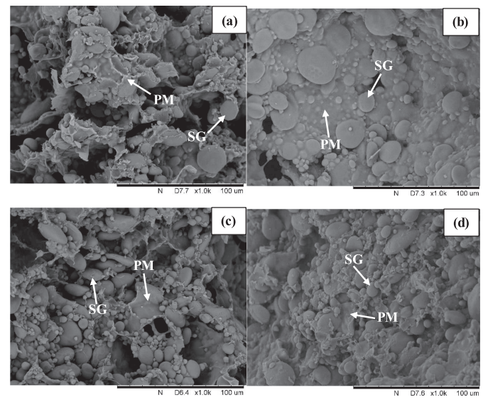 通过扫描电镜观察全麦面团的微观结构得出,发现了亲水胶体促进全麦面团形成连续面筋网络,并强化淀粉颗粒和蛋白质分子之间作用。因此,亲水胶体可应用于调控全麦面团的微观结构,在改善全麦产品品质方面发挥潜在作用。