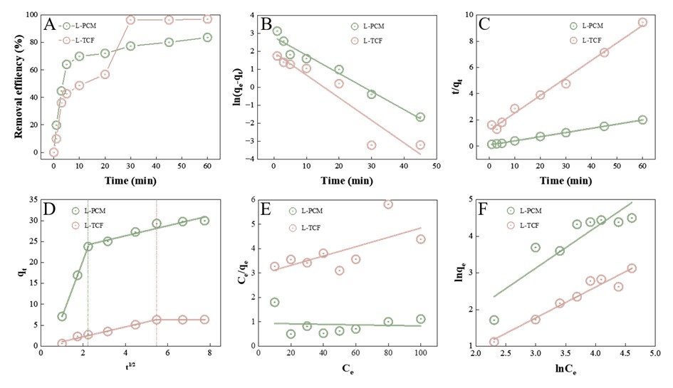 图6 L-PCM 和L-TCF对Pb(II)的吸附行为分析:(A) 吸附时间对吸附效率的影响; 吸附动力学模型拟合:(B)准一级,(准)二级,(D)颗粒扩散模型;等温吸附模型拟合:(E)Langmuir,(F)Freundlich