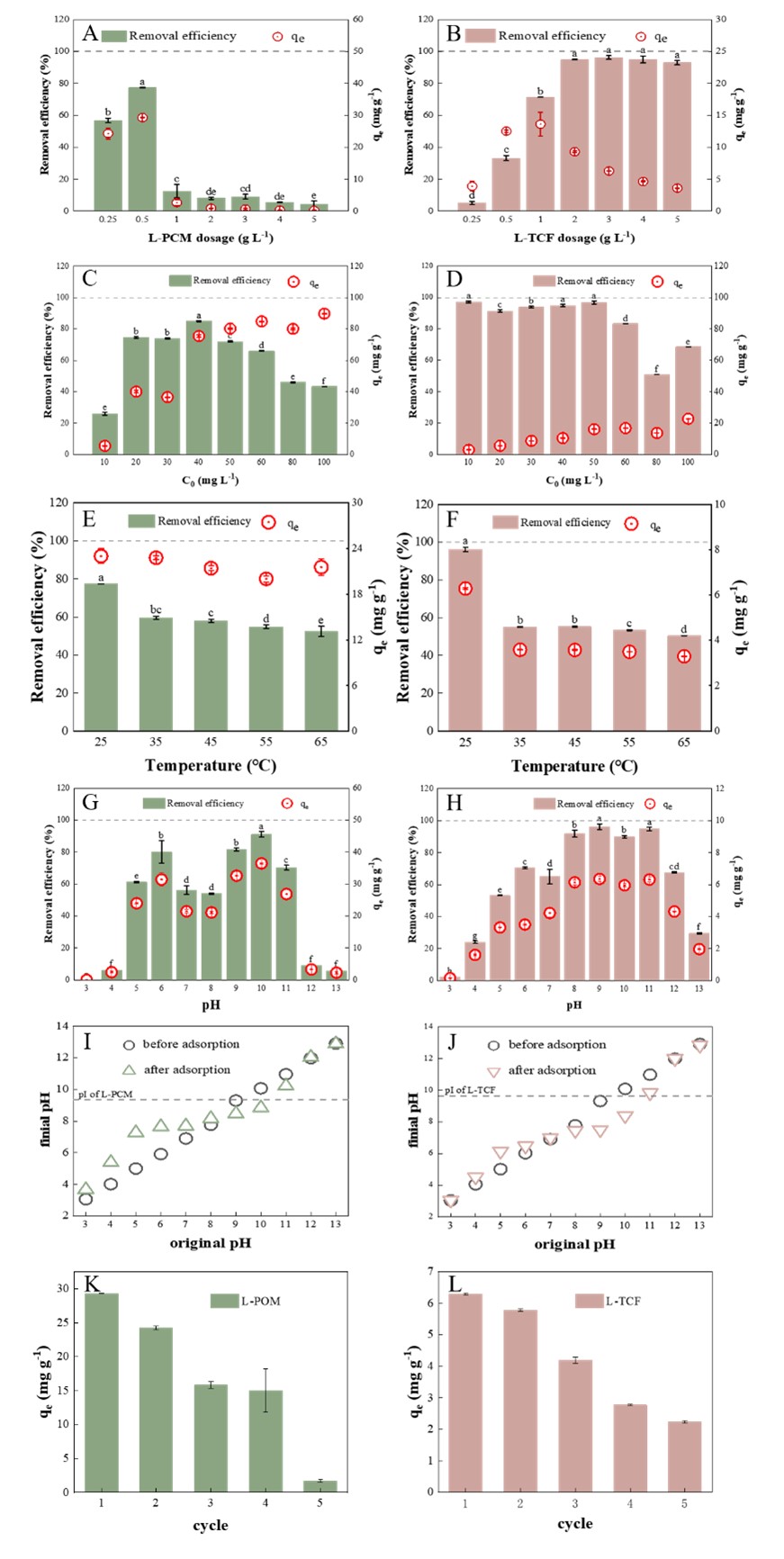 图5 对Pb(II)吸附效率和吸附容量的影响。吸附剂用量:(A)L-PCM,(B)L-TCF;Pb(II)初始浓度:(C)L-PCM,(D)L-TCF;反应温度:(E)L-PCM,(F)L-TCF;初始pH:(G)L-PCM,(H)L-TCF;溶液pH值变化:(I)L-PCM,(J)L-TCF;可回用性(K)L-PCM,(L)L-TCF
