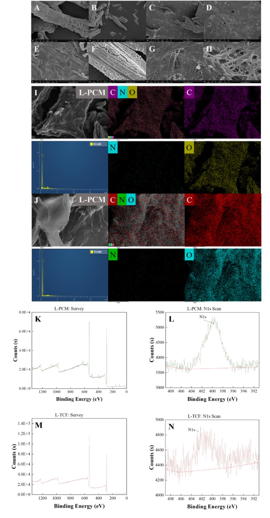 图3 不同放大倍数下吸附剂的SEM;5k:(A)MCC,(B)L-PCM,(C)CNF,(D)L-TCF;5w:(E)MCC,(F)L-PCM,(G)CNF,(H)L-TCF。(I)L-PCM,(J)L-TCF的EDS能谱;XPS谱图:(K)L-PCM全谱图,(L)L-PCM N1s扫描图,(M)L-TCF全谱图,(N)L-TCF N1s扫描图。