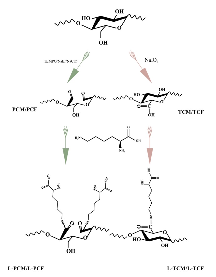 图1 两种氧化活化方法制备L-赖氨酸功能化纤维素基吸附剂的示意图