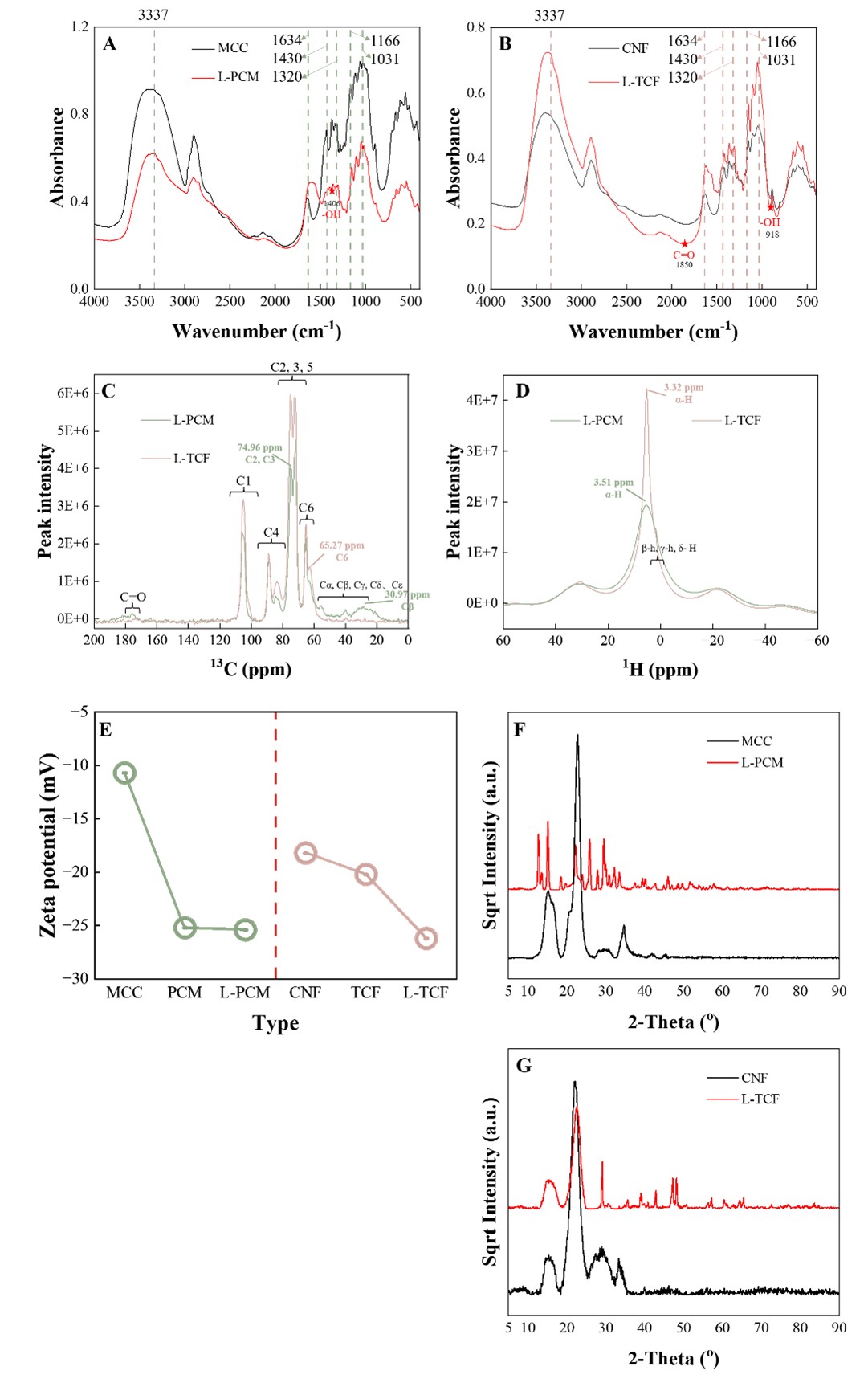 图4 吸附剂的红外光谱:(A)MCC和L-PCM,(B)CNF和L-TCF;L-PCM和L-TCF的核磁共振光谱:(C)13C,(D)1H;吸附剂的性质:(E)Zeta电位;(F)MCC和L-PCM的XRD图谱;(G)CNF和L-TCF的XRD图谱