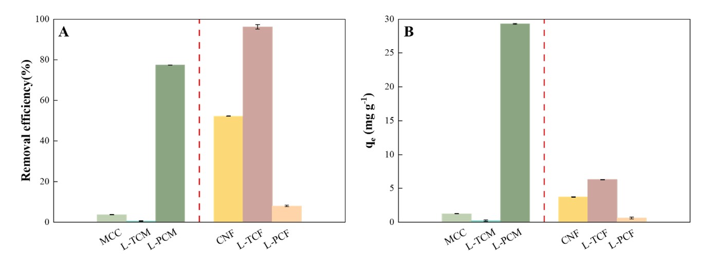 图2 不同改性方法对纤维素基吸附剂去除Pb(II)的影响:(A)吸附效率,(B)吸附容量