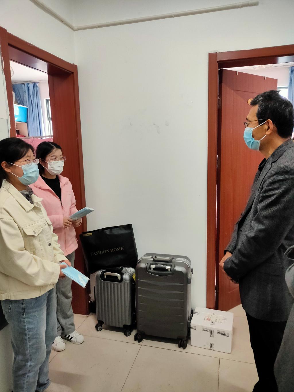 许文彪书记向在场的学生表达了学院的关心,赠送了学院为大家准备的防护口罩,并叮嘱大家要做好防疫防护工作,保护好自己的健康安全,学院会全心全意保障大家在校期间的学习生活,为大家营造一个安全、温暖、舒适的校园生活环境。在校期间要保证身体、心理双健康,珍惜校园稳定安全的环境。周进进老师详细了解我院学生当前心理状况、生活情况以及存在的困难,并叮嘱他们注意自身防护,确保身体健康,更好地适应隔离生活,隔离期间正好也是提升自己的好时机,要按时上课,完成学业任务,严格遵守防控规定,为疫情防控做贡献。