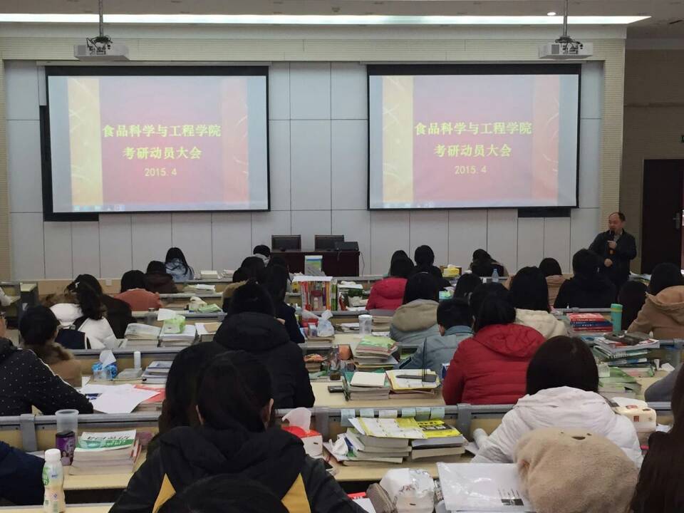 4月8日中午,金沙城js9线路检测中心考研动员大会在我校仙林校区食品科学与工程楼考研自习教室顺利开展,院长胡秋辉,团总支书记周进进及一百多名2016考研同学们参与了此次动员大会。