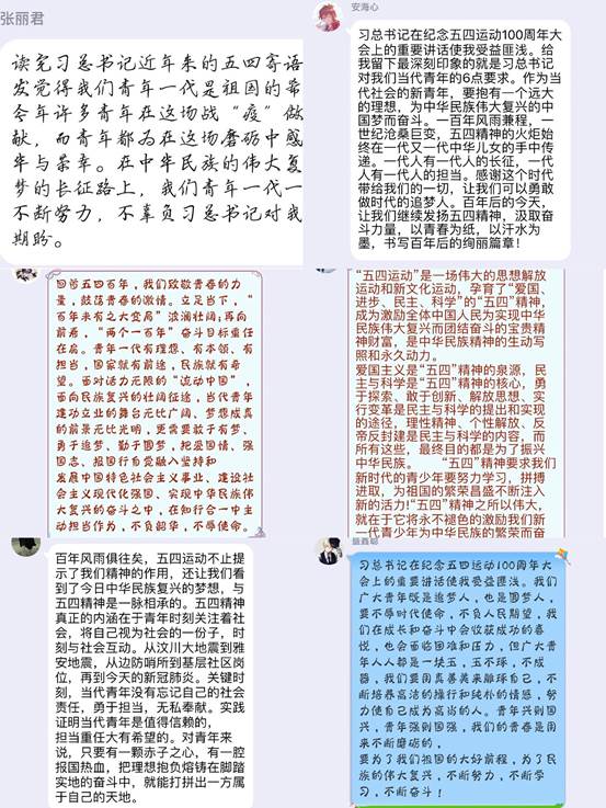 为深入学习贯彻习近平总书记在五四青年节对新时代青年的寄语,省委书记娄勤俭对江苏青年的寄语,强调坚定理想信念,站稳人民立场,练就过硬本领,投身强国伟业,用青春承载梦想,用奋斗创造未来,金沙城js9线路检测中心师生通过线上线下多种方式,深入学习、交流讨论,他们纷纷表示,要牢记习近平总书记和娄勤俭书记的寄语,继承和发扬五四精神,为推动学校加快高水平财经大学建设、为实现中华民族伟大复兴的中国梦贡献青春力量!