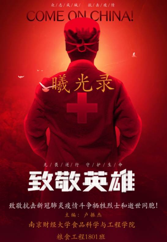 新冠疫情发生以来,全国上下同心战“疫”,抗击疫情英雄的逆行大爱、家国情怀、科研攻关、无私奉献精神,深深感动着每一位南财学子。为弘扬英雄精神和唱响时代主旋律,金沙城js9线路检测中心粮工1801班团支部号召全体团员、同学立足实际,开展学习英雄、感怀英雄、讴歌英雄的主题征文活动。
