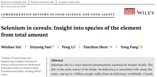 2021年4月,食品国际TOP学术期刊Comprehensive Reviews in Food Science and Food Safety(IF 9.9)发表了我院题为 “Selenium in cereals: Insight into species of the element from total amount” 的论文。该文系统地阐述了谷物中硒的含量和生物强化途径,论述了谷物中不同化学形态硒的分析流程和技术方法,揭示了硒的形态与其生物活性的关系,讨论了谷物来源的硒相关研究未来面临的主要问题和发展趋势。农作物因受到遗传品种、土壤条件、栽培方式以及加工方式的影响,导致谷物中硒含量变化范围较大,通过外源施用硒肥的方式可以大幅提高谷物籽粒中的硒含量。目前,最主要的谷物硒形态分析流程包括提取、分离和检测三个主要步骤,最常用的分析技术方法是通过温和适宜的酶促提取法获得各形态的硒,再用高效液相色谱(HPLC)联用电感耦合等离子体质谱(ICP-MS)分析定量硒的具体形态。谷物中含有无机硒(硒酸盐、亚硒酸盐)和有机硒,包括硒代甲硫氨酸(SeMet)和小分子硒肽等。有机硒比无机硒具有更好的生物利用度、更高的营养价值和更低的毒性,活性硒肽具有抗氧化、免疫调节、缓解重金属毒性等多种生理功能。谷物的硒形态以SeMet为主,还有多种活性硒肽,表明谷物是膳食硒的优良载体。文章强调在评价硒的营养健康作用,不仅仅考虑硒的摄入总量,而且也应考察硒的具体存在形态。因此,复杂样品中硒形态的高通量和快速高效的分析手段是未来的重要研究挑战,硒形态和生理功能的构效关系及其作用机理仍然是重要研究方向。
