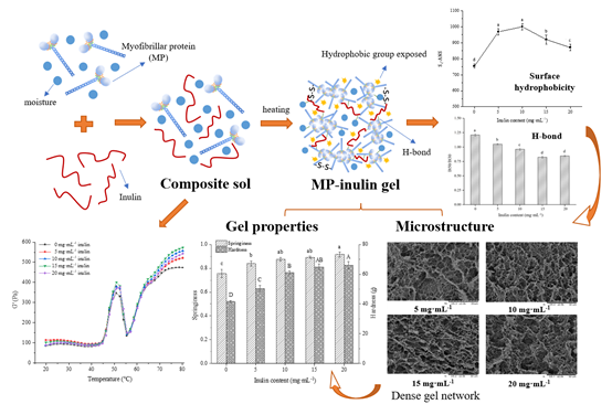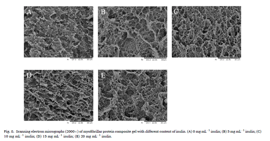 结果表明,添加5~20 mg/mL菊粉时MP-菊粉凝胶的弹性和硬度显著增加,而添加5~10 mg/mL菊粉时,持水力(WHC)显著增强(P<0.05)。改善MP混合凝胶性能的最适菊粉添加量为10 mg/mL。添加20 mg/mL菊粉可降低混合凝胶的蒸煮损失。菊粉中螺旋结构的疏水中心诱导更多的MP疏水基团暴露,从而增强了MP分子之间的疏水相互作用。添加菊粉减少了总巯基含量,促进凝胶中MP分子二硫键的形成。添加菊粉显著降低拉曼光谱中I850/I830,菊粉的添加加强了MP分子间的氢键作用,菊粉的羟基可以与MP的羟基形成氢键。然而,菊粉对MP分子之间的静电相互作用几乎没有影响。在加热过程中,在凝胶形成和强化阶段添加15 mg/mL菊粉的MP样品具有最高的储能模量(G')。当菊粉添加量超过10 mg/mL时,肌球蛋白的变性焓(ΔH)值降低,但不影响其变性温度。微观结构表明,含10 mg/mL菊粉的MP复合凝胶具有致密均匀的网络结构。