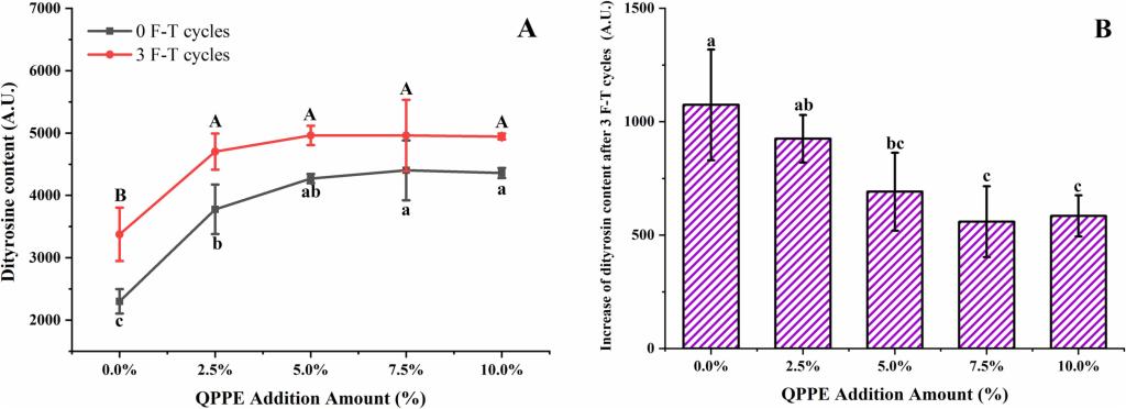 F-T循环后,二硫键的构象从g-g-t和t-g-t变为g-g-g,5.0%~7.5%的QPPE稳定了t-g-t构象的变化。此外,添加7.5%的QPPE显著降低了F-T循环后二酪氨酸含量的增加,表明其具有减缓MPG蛋白质氧化的作用。