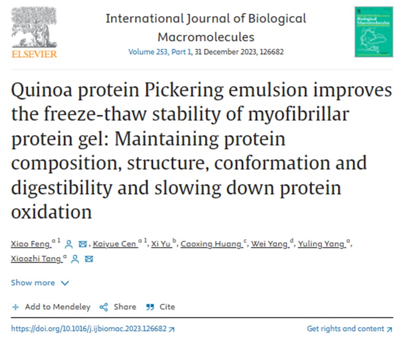 2023年5月1日,金沙城js9线路检测中心冯潇、汤晓智(通讯作者)在国际TOP期刊International Journal of Biological Macromolecules(Q1,IF: 8.2)发表题为“Quinoa protein Pickering emulsion improves the freeze-thaw stability of myofibrillar protein gel: Maintaining protein composition, structure, conformation and digestibility and slowing down protein oxidation”的研究性论文。