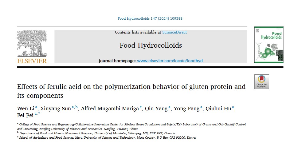 2023年10月9日,金沙城js9线路检测中心李文(第一作者)、裴斐(通讯作者)在国际TOP期刊Food Hydrocolloids(Q1,IF: 10.7)发表题为“Effects of ferulic acid on the polymerization behavior of gluten protein and its components”的研究性论文。