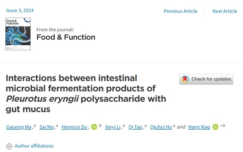 2024年2月5日,金沙城js9线路检测中心马高兴副教授在国际TOP期刊Food & Function(Q1,IF: 6.1)发表题为“Interactions between intestinal microbial fermentation products of Pleurotus eryngii polysaccharide with gut mucus”的研究性论文。