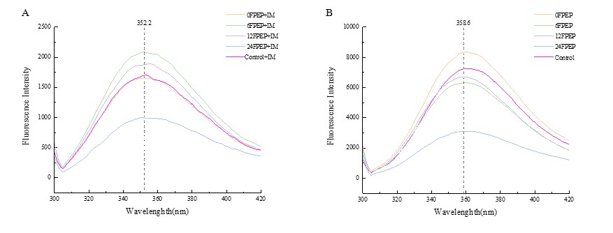 图3:杏鲍菇多糖发酵产物与肠黏液相互作用形成的复合物的荧光光谱(A);杏鲍菇多糖发酵产物的荧光光谱(B)