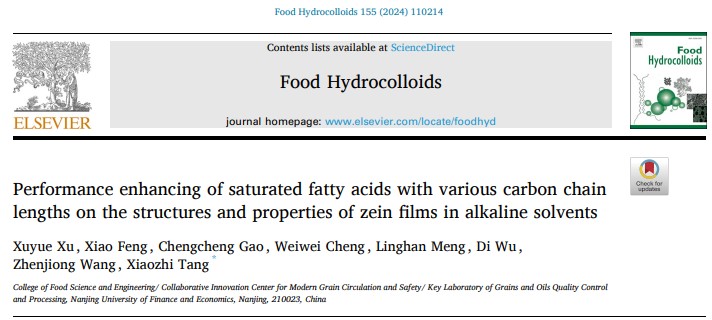 2024年5月,金沙城js9线路检测中心汤晓智教授课题组在期刊Food Hydrocolloids(Q1,IF: 11)发表题为“Performance enhancing of saturated fatty acids with various carbon chain lengths on the structures and properties of zein films in alkaline solvents”的研究性论文。