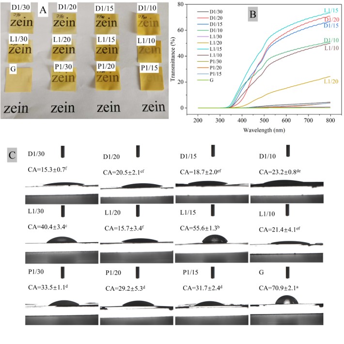 Figure 6 (A) Appearance, (B) light transmittance, and (C) contact angle of G-, D-, L-, P-films.