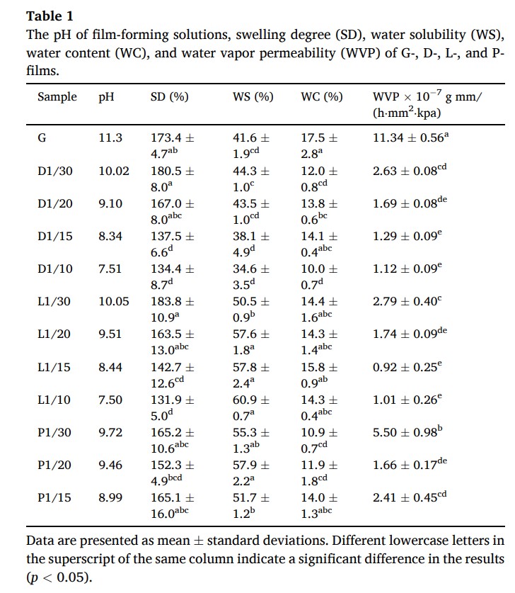 由于在碱性溶剂中的脱酰胺反应,玉米醇溶蛋白的结晶度在成膜后降低。SEM、XRD和FTIR分析结果表明,脂肪酸和玉米醇溶蛋白之间的相互作用降低了蛋白质分子的有序度,增加了玉米醇溶蛋白与甘油和碱性溶剂的相容性。这有助于减少玉米醇溶蛋白在成膜过程中的聚集,从而使薄膜具有致密的微观结构。研究发现,添加比例为玉米醇溶蛋白重量1/15的癸酸或月桂酸,可以获得具备良好紫外线阻隔和可见光透射率,以及相对优异的机械和水蒸气阻隔性能的薄膜。这些信息将有助于减少使用有机溶剂开发玉米醇溶蛋白基的食品包装薄膜。