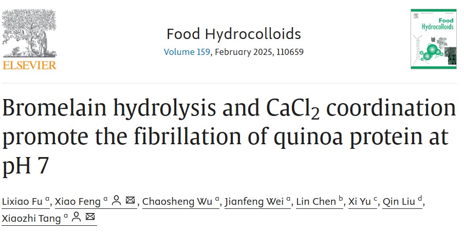 近期,南京财经大学汤晓智教授、冯潇副教授在国际食品TOP期刊Food Hydrocolloids (Q1, IF=11.0)发表题目为“Bromelain hydrolysis and CaCl2 coordination promote the fibrillation of quinoa protein at pH 7”的研究性论文。